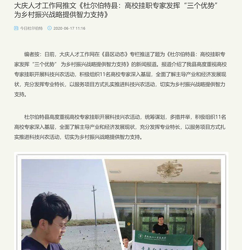 我們的口碑 大慶人才工作網推文《杜爾伯特縣:高校掛職專家發揮“三個優勢” 為鄉村振興戰略提供智力支持》